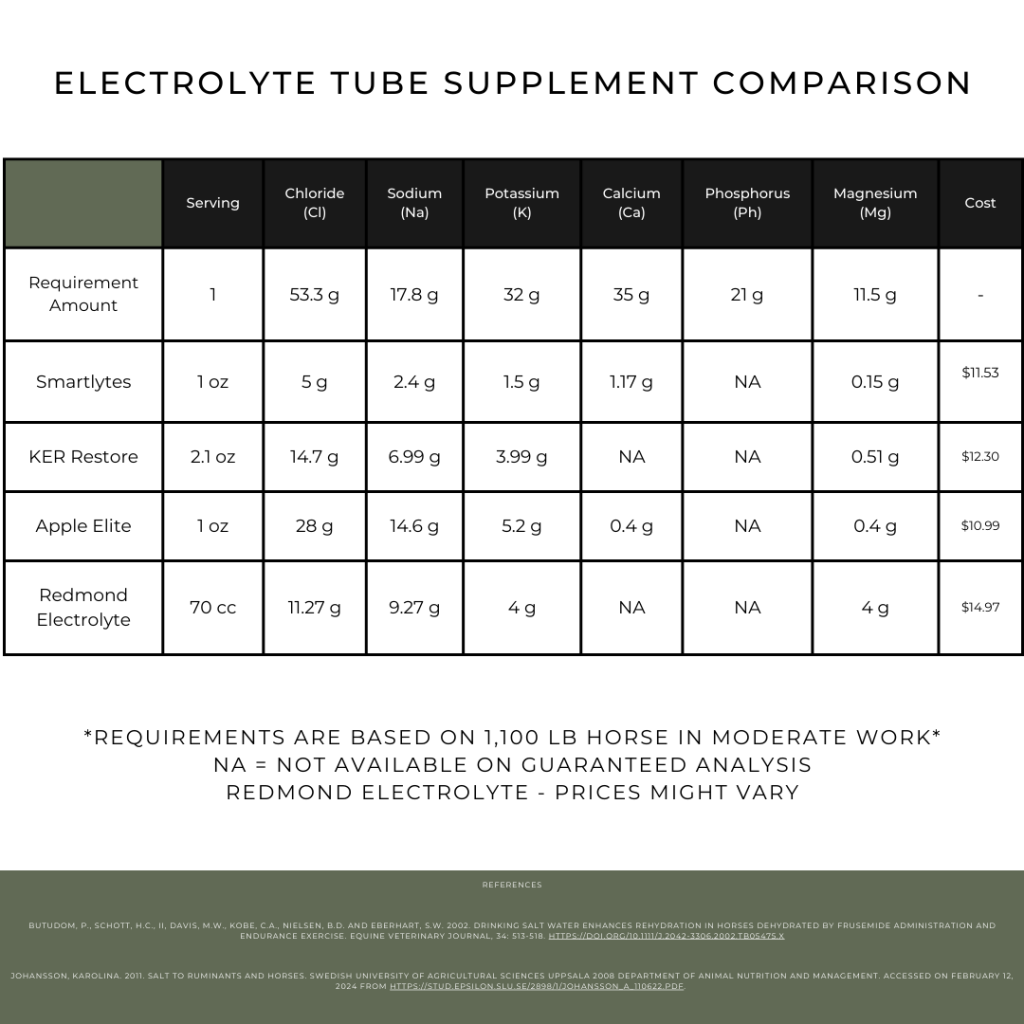 Choosing the right electrolyte supplement for your horse is essential for maintaining hydration, peak performance, and overall health. In our recent comparison, we’ve taken a closer look at the electrolyte values for Smartlytes, KER Restore, Apple Elite, and Redmond Electrolyte Paste. To help you make an informed decision, we’ve created a comparison chart that breaks down these products based on the required amounts of electrolytes, which are supported by research and references listed.