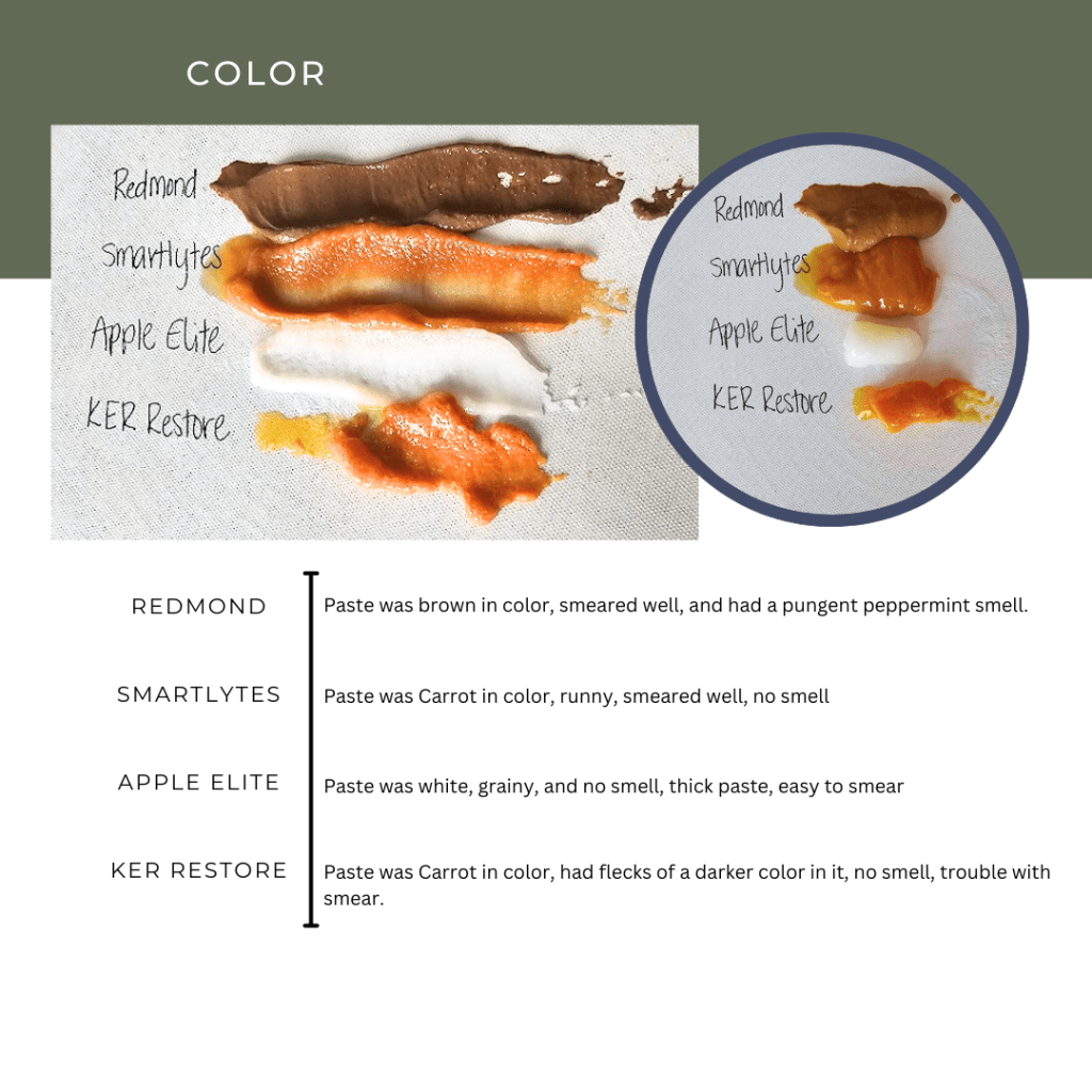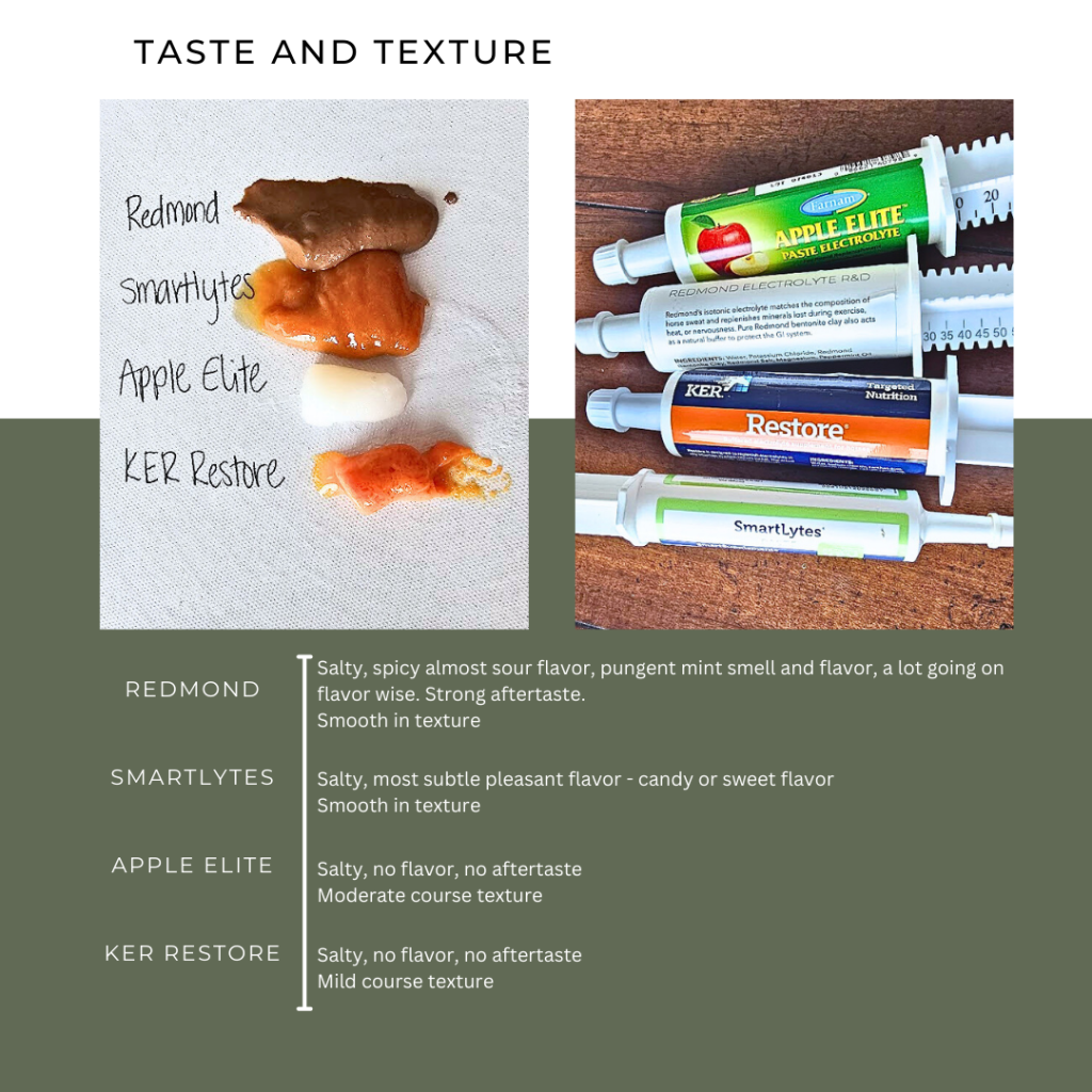 Apple Elite had one of the best ingredient compositions in this lineup, making it an attractive choice for those who prioritize formula quality. The paste was white in color, thick, and grainy, with no noticeable smell. Unlike Redmond or Smartlytes, this paste had no flavor or aftertaste, which can be a plus for sensitive horses. The larger tube size and included measuring ring made dosing accurate and easy, a big advantage over Smartlytes. However, the thick and chunky texture made it slightly more difficult to work with. Despite that, Apple Elite remains a great option for those looking for precise dosing and a well-balanced electrolyte formula. It’s also easy to find through Chewy, SmartPak, and tack stores.