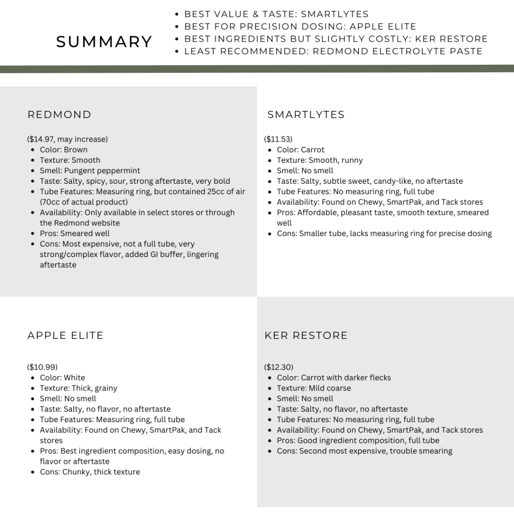Whether you’re prioritizing price, ingredient composition, or ease of dosing, this comparison will give you the insight you need to choose the best electrolyte paste for your horse.